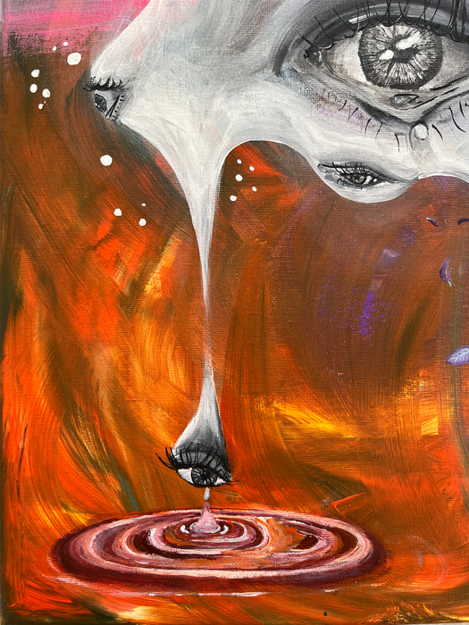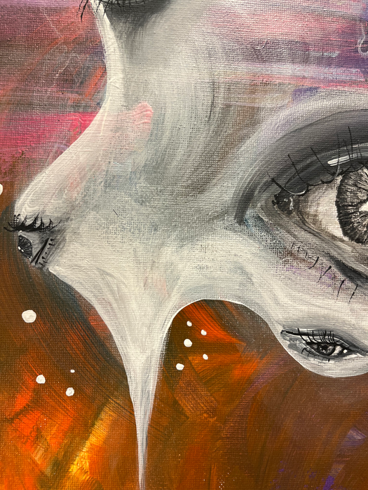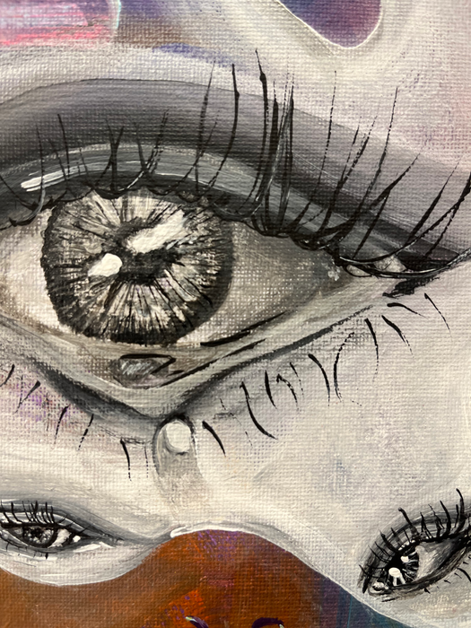 "Who" is an acrylic piece that holds a deeply personal meaning for me. I created the background with no clear direction in mind, and it stayed unfinished for almost a year as I grappled with how to complete it. This mirrors my own experiences with severe anxiety about death, which often leads to episodes of derealization and depersonalization. These moments leave me feeling disconnected from reality yet hyper-aware of consciousness, the subconscious, and what it feels like to float between realms. The eyes in this piece represent the windows of the soul—a reflection of how I process those overwhelming emotions and try to make sense of what it means to truly exist.